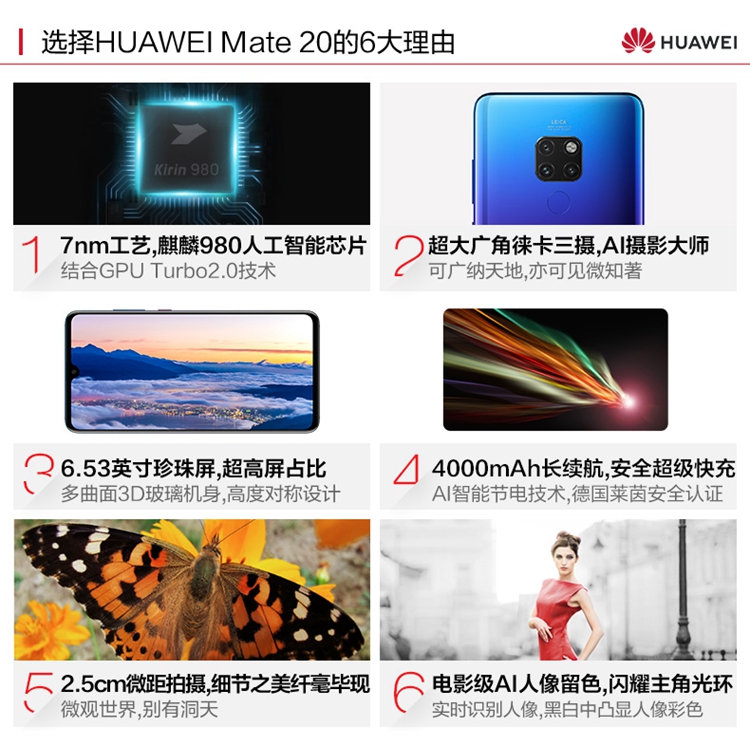 华为 HUAWEI Mate 20 麒麟980AI智能芯片全面屏超微距影像超大广角徕卡三摄6GB+128GB亮黑色全网通版双4G手机